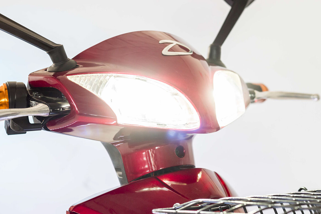 El scooter viene equipado de serie con una gran caja de carga trasera y una canasta de carga delantera.