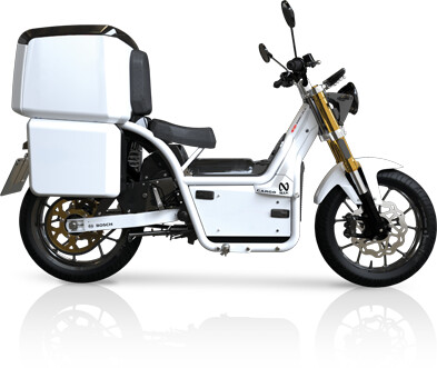 El ciclomotor de carga industrial ofrece espacio para 4 baterías de litio extraíbles con una autonomía continua de hasta 300 km. El tiempo de carga de las baterías es 270 minutos y una opción de carga rápida permite cargar las baterías en 270 minutos. Cargando las baterías durante su uso, el scooter puede operar las 24 horas.